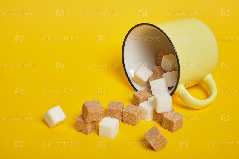Кубики тростникового коричневого и белого сахара выпали из желтой чашки на желтом фоне