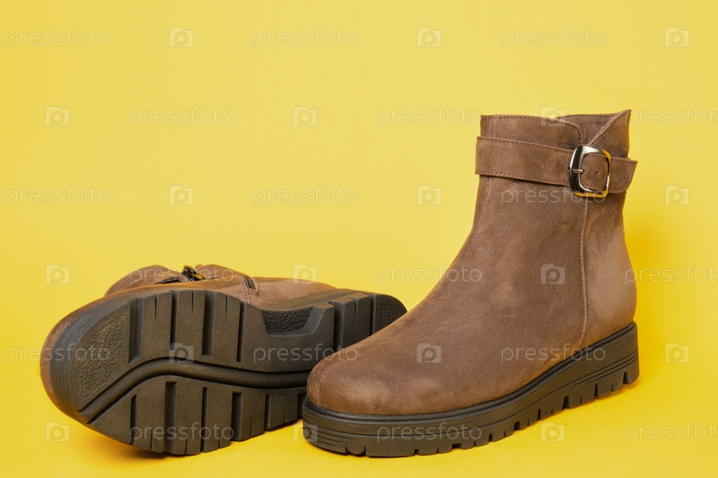 Женские коричневые замшевые модные сапоги на желтом фоне