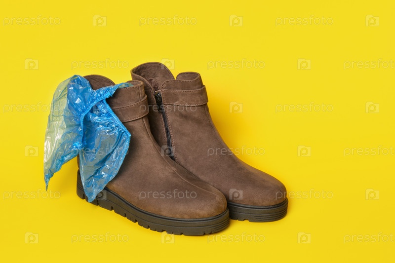 Коричневые замшевые зимние сапоги и синие пластиковые бахилы на желтом фоне