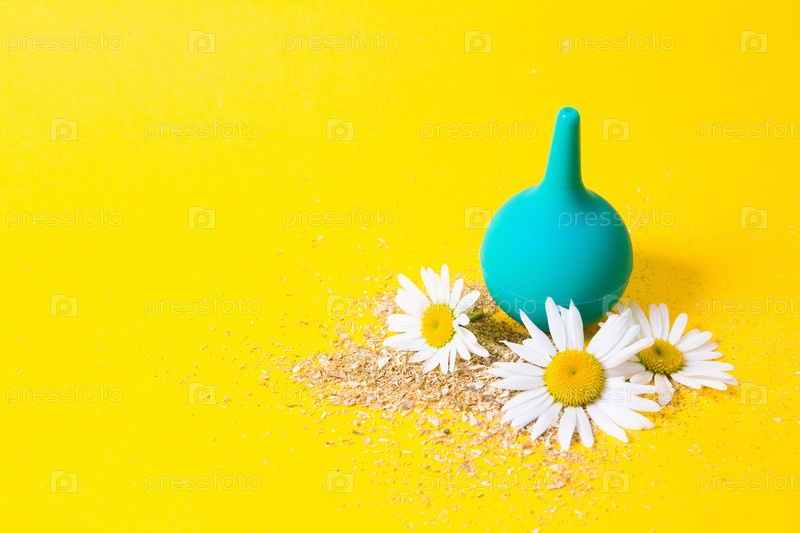 Зеленая маленькая клизма и ромашка на желтом фоне
