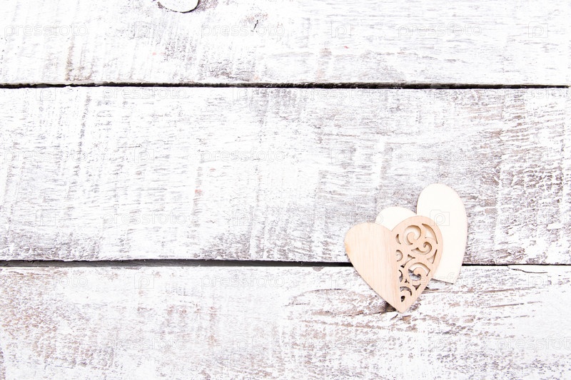 Деревянные сердца на белых деревянных досках, пространство для копирования, сердце с резными узорами