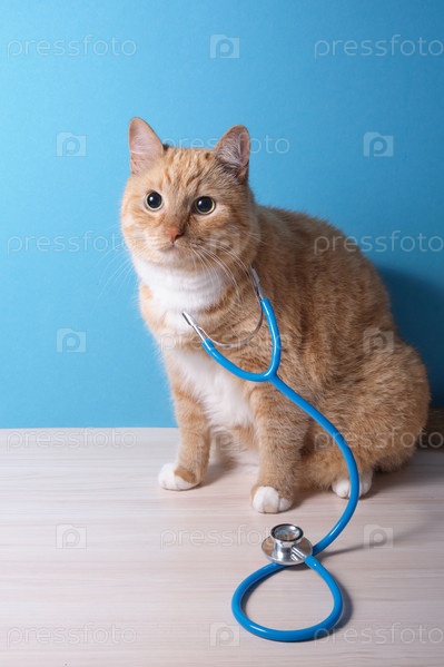 Милый рыжий кот со стетоскопом на синем фоне, концепция ветеринарной клиники