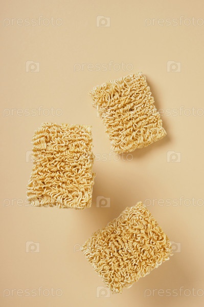Сушеная лапша быстрого приготовления на бежевом фоне. вид сверху