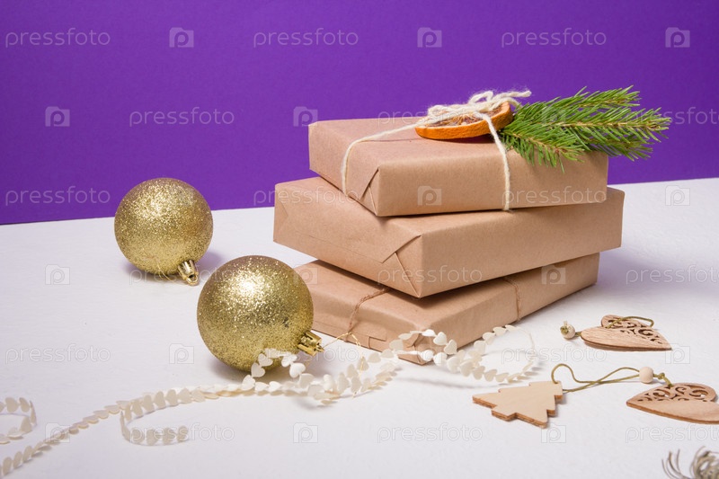Блестящие золотые шары для елки и несколько подарочных коробок, завернутые в крафт-бумагу и украшенные натуральными материалами на фиолетовом фоне, эко рождественская концепция