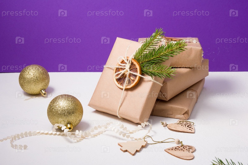 Блестящие золотые шары для елки и несколько подарочных коробок, завернутые в крафт-бумагу и украшенные натуральными материалами на фиолетовом фоне, эко рождественская концепция