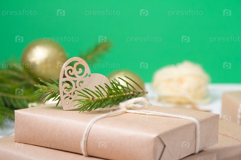 Подарочная коробка, завернутая в крафт-бумагу и украшенная деревянным сердцем и еловой веткой на желтом фоне, эко рождественская концепция