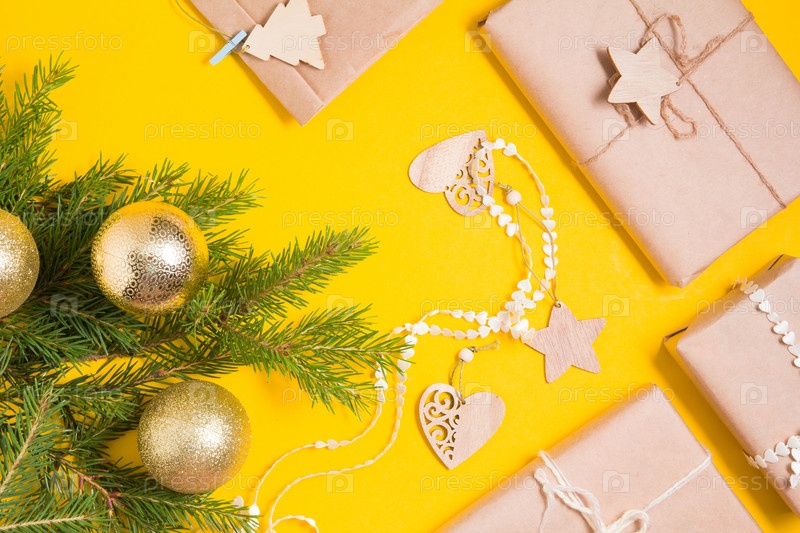 Еловые ветки, блестящие золотые шары для елки и несколько подарочных коробок, упакованных в крафт-бумагу и украшенных деревянными фигурками на желтом фоне, эко рождественская концепция