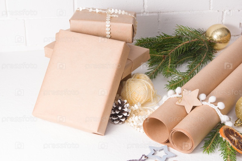 Украшение новогодних подарков в эко стиле, бумага для упаковки, декор из натуральных материалов и подарочные коробки на белом фоне, домашний декор на рождество и новый год, макет