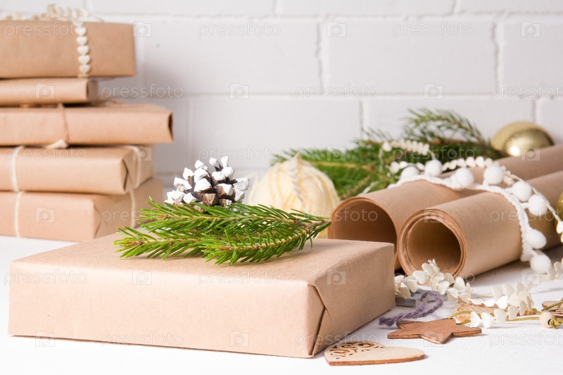 Украшение новогодних подарков в эко стиле, бумага для упаковки, декор из натуральных материалов и подарочные коробки на белом фоне, домашний декор на рождество и новый год
