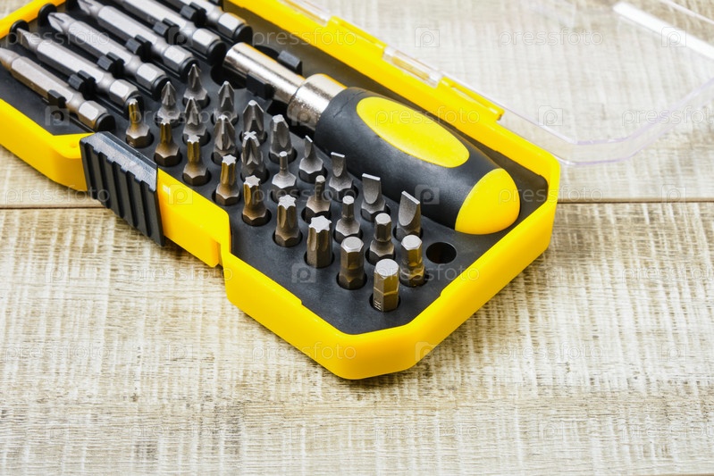 Отвертка и насадки в пластиковой коробке, место для копирования, насадки для отверток