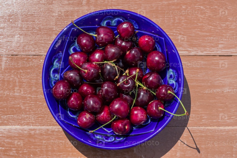 Синяя тарелка спелой черешни на деревянном столе