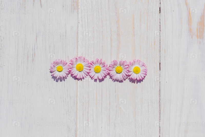 Розовые цветы ромашки на фоне деревянного стола с копией пространства