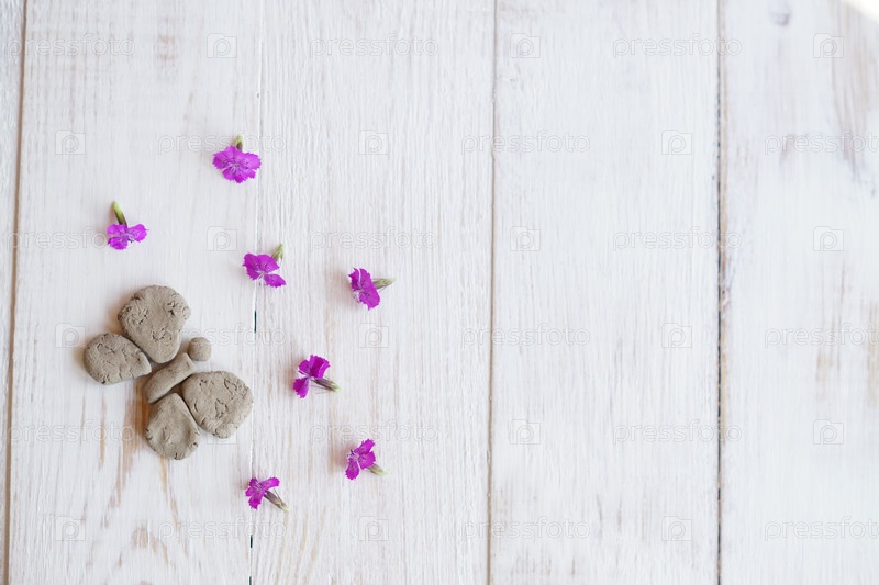 Вид сверху, глиняная бабочка и розовые цветы на белом деревянном фоне