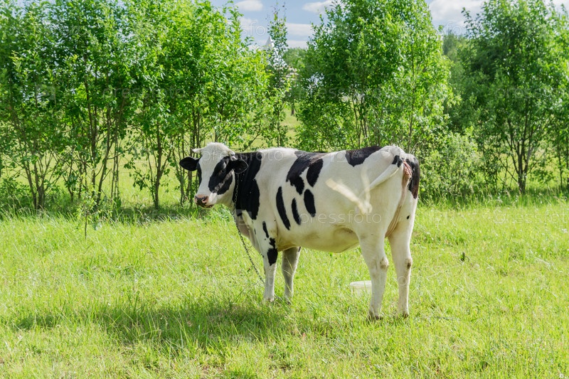 Черно-белая корова в поле на фоне молодых деревьев