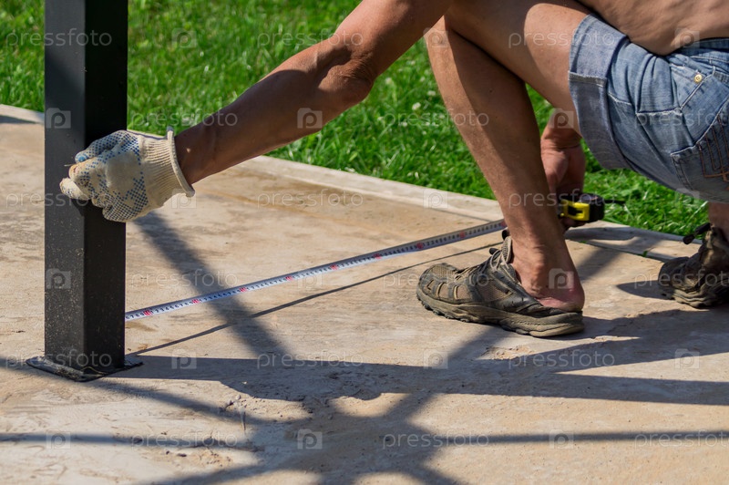 Строитель измеряет расстояние рулеткой на улице