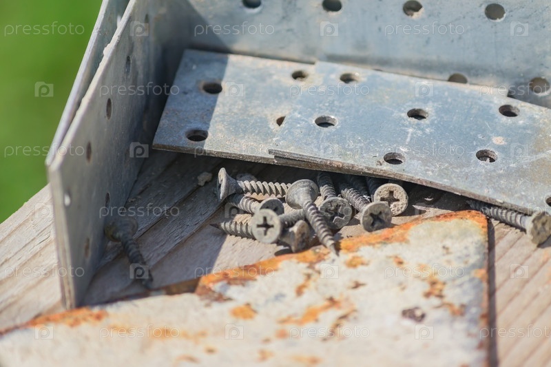 Крупный план строительных инструментов - металлические уголки, винты на деревянном верстаке на открытом воздухе