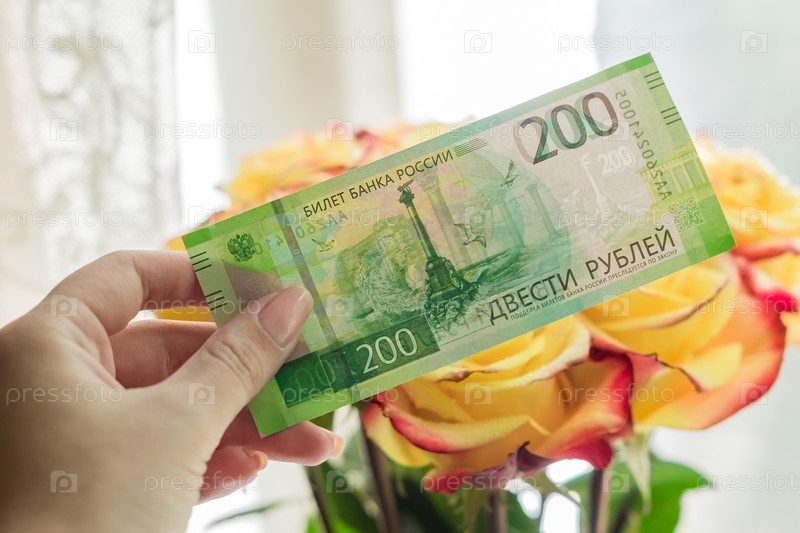 Женская рука держит новые российские банкноты. двести рублей. Наличные бумажные деньги