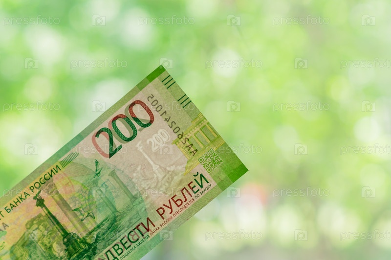 Новая российская банкнота на зеленом фоне боке. двести рублей. Наличные бумажные деньги
