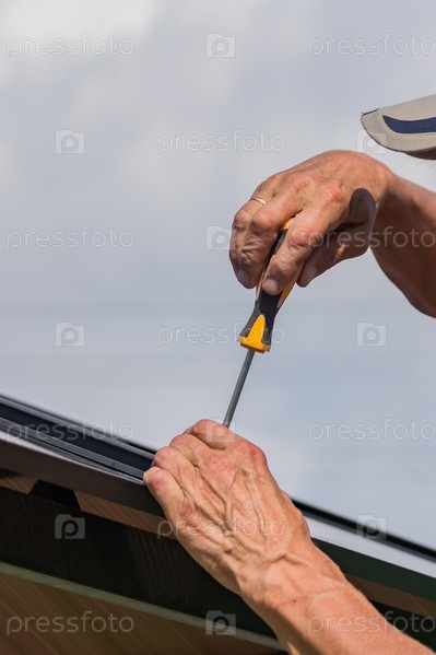 Отвертка в мужских руках. Рабочий с ручным инструментом, собирающий металлоконструкции на открытом воздухе