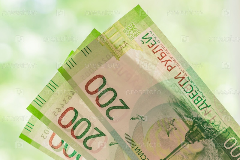 Новые российские банкноты на зеленом фоне боке. двести рублей. Наличные бумажные деньги