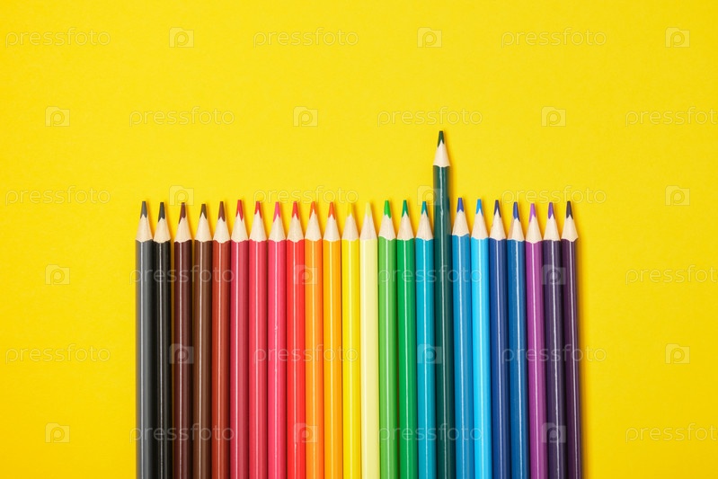 Цветные карандаши на желтом фоне вид сверху