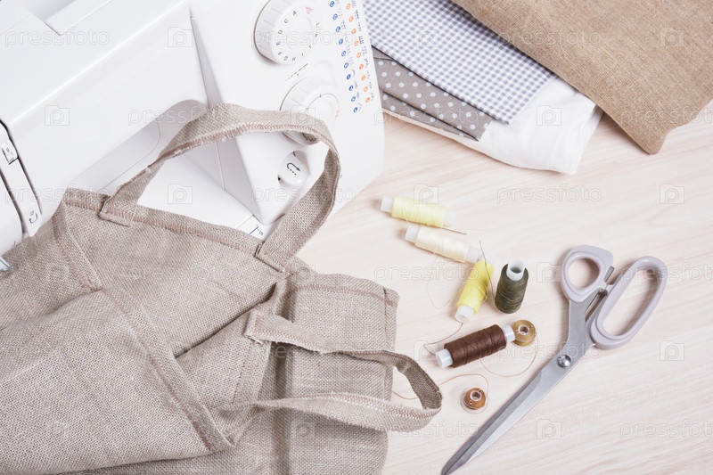 Катушки с нитками, ножницы, швейная машинка и мешок из экольняного льна, самодельная хозяйственная сумка