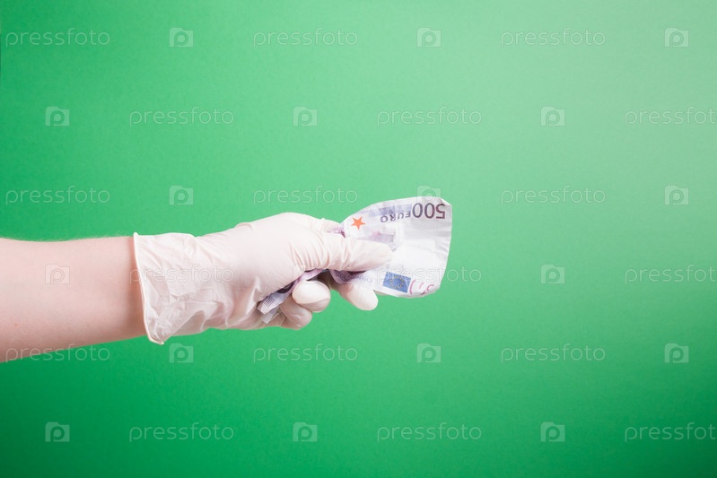 Рука в резиновой перчатке держит скомканную купюру в 500 евро на зеленом фоне