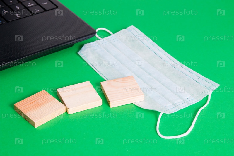 Маска из трех деревянных блоков и компьютер