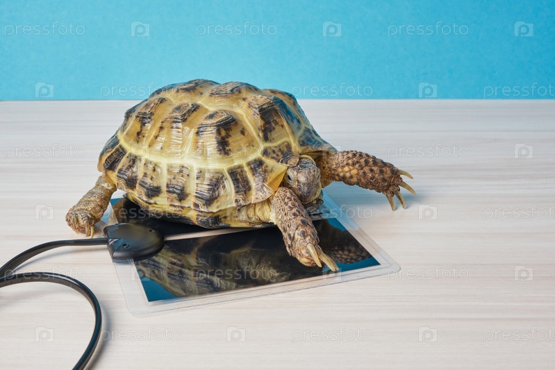 Среднеазиатская наземная черепаха греется на специальной грелке для рептилий, теплое место для террариума