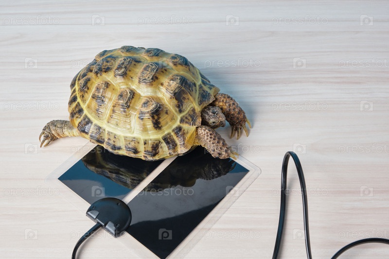Сухопутная среднеазиатская черепаха греется на специальной грелке для рептилий, оборудование для террариума
