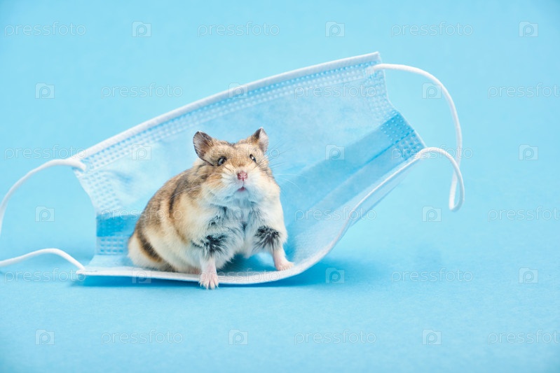 Маленький хомяк и маска для лица на синем фоне