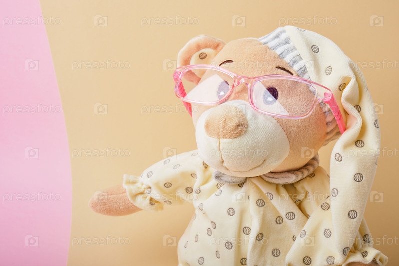 Милый плюшевый мишка в очках на бежевом и розовом фоне