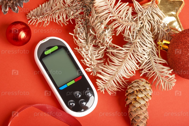 Глюкометр рождественские и новогодние украшения, концепция диабета и праздников