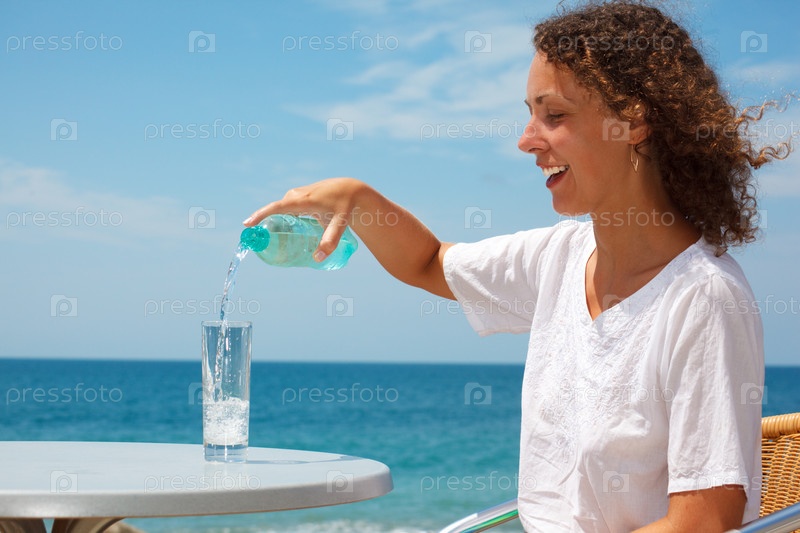 Девушка на пляже сидит за столом и наливает воду в стакан