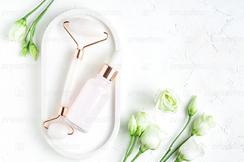 Красивая композиция из флакона с сывороткой без торговой марки, ролик для лица из розового кварцевого камня на белом фоне. Концепция антивозрастной косметики. Креативная модная косметика с цветами эустомы и копией пространства