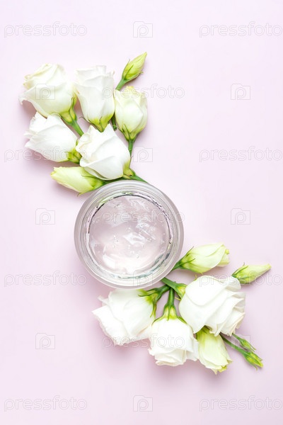 Вид сверху на стеклянную банку с прозрачным косметическим гелем для лица и тела. Упаковка продукта по уходу за кожей представляет собой цветочную композицию на розовом фоне