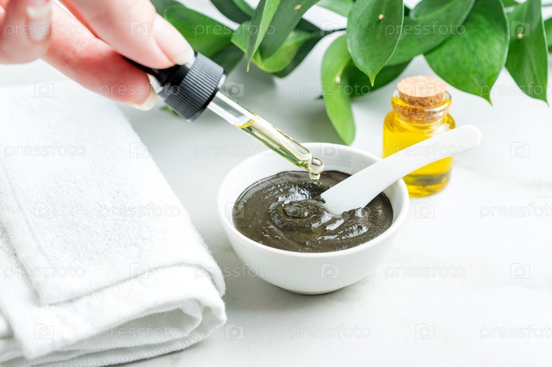 Питательная домашняя маска из черной глины с эфирным маслом. Спа-процедуры в домашних условиях. Концепция ухода за кожей. Травяная альтернативная косметика