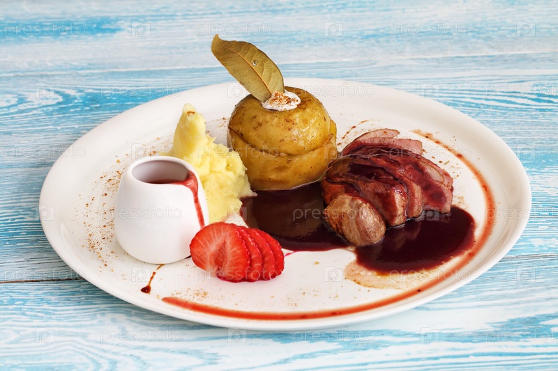 Утка по-пекински на белой тарелке с картофельным пюре и гранатовым соусом