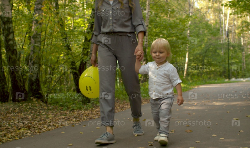 Мать и ее сын идут рука об руку. Молодая женщина и забавный ребенок в парке. День матери