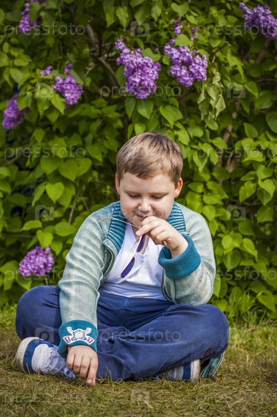 Мальчик позирует возле пышной сирени. Портрет детей с интересным выражением лица. Взаимодействия. Выборочный фокус