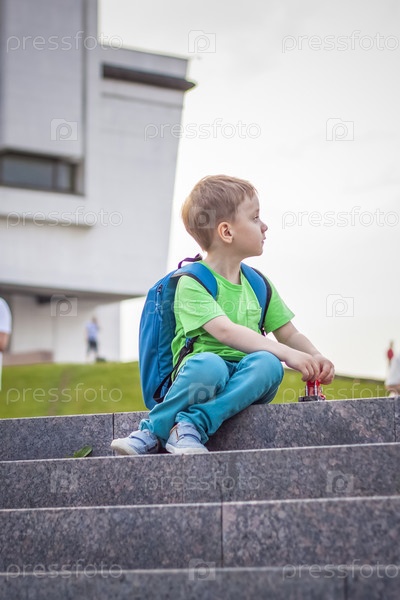 Мальчик играет с игрушкой, сидя на ступеньках под открытым небом на фоне небоскребов и многоэтажек. Путешествие. Образ жизни в городе
