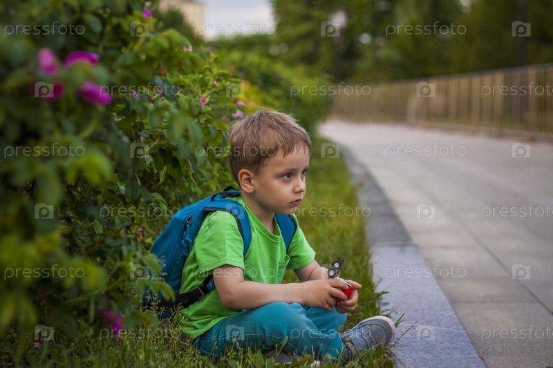Портрет ребенка, мальчика на фоне растений в парке под открытым небом. Дети, Путешествие. Образ жизни в городе. Центр, улицы