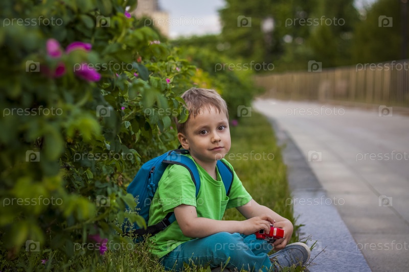 Портрет ребенка, мальчика на фоне растений в парке под открытым небом. Дети, Путешествие. Образ жизни в городе. Центр, улицы