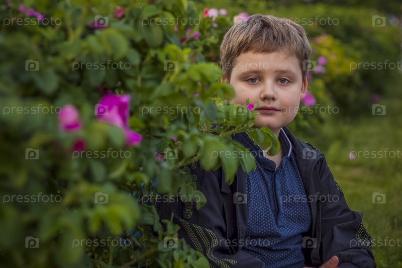 Портрет ребенка, мальчика на фоне растений в парке под открытым небом. Дети, Путешествие. Образ жизни в городе. Центр, улицы