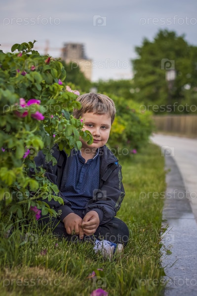 Портрет ребенка, мальчика на фоне растений в парке под открытым небом. Дети, Путешествие. Образ жизни в городе. Центр, улицы