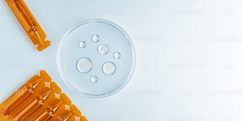 Пластиковые ампулы с витаминами для волос и концентратом для ухода за волосами. Чашка Петри с образцами масла или сыворотки. Копирование пространства, баннер