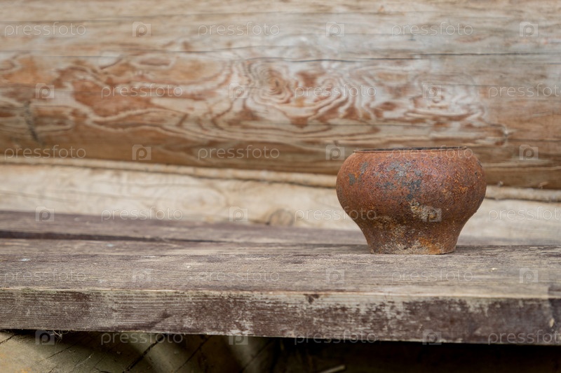 Старый ржавый металлический чугун на деревянном столе на открытом воздухе