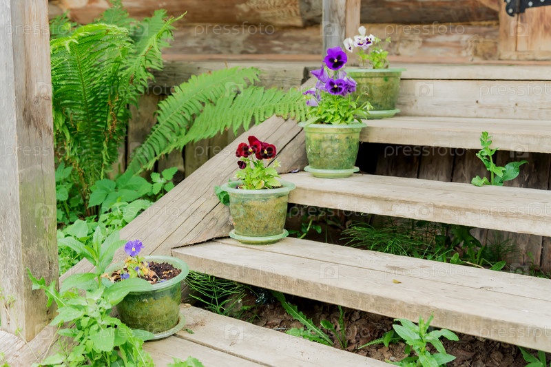 Пластиковые цветочные горшки с разноцветными анютиными глазками стоят на деревянной лестнице для украшения, деревенский стиль