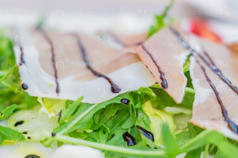 Салат прошутто ди парма с миксом салатных листьев, бальзамическим уксусом и сыром моцарелла, мягкий фокус