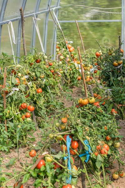 Свежие помидоры в саду в солнечный день. органические помидоры в теплице. Концепция выращивания овощей